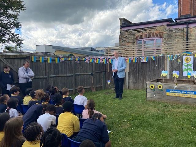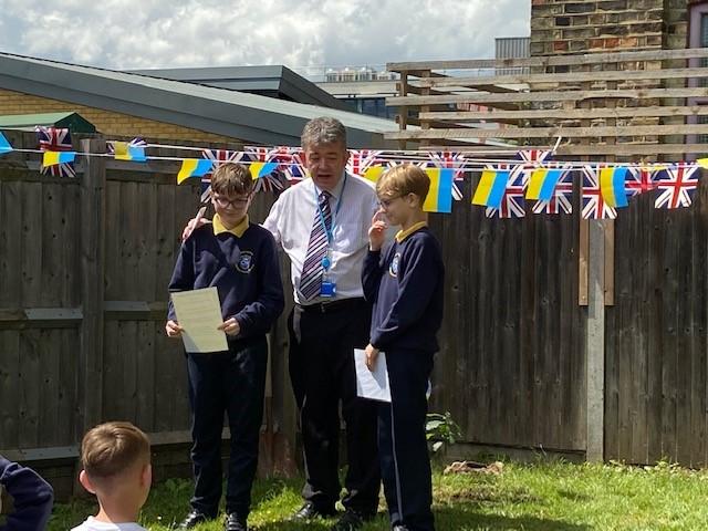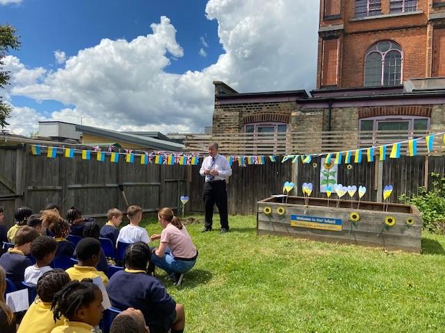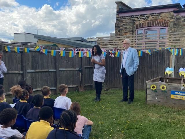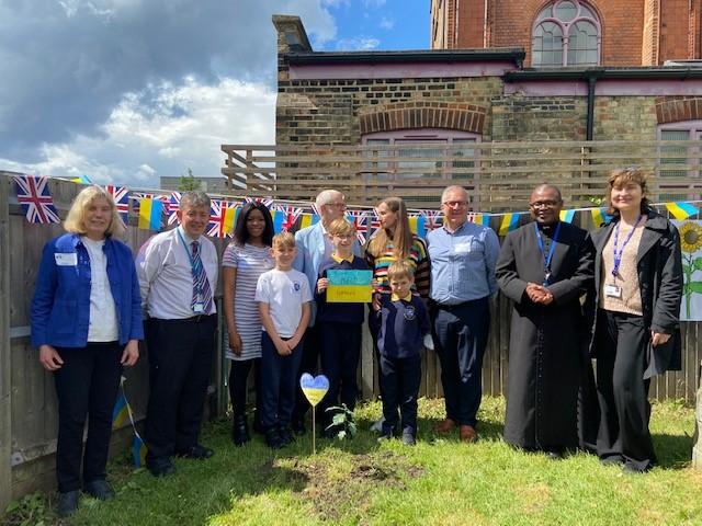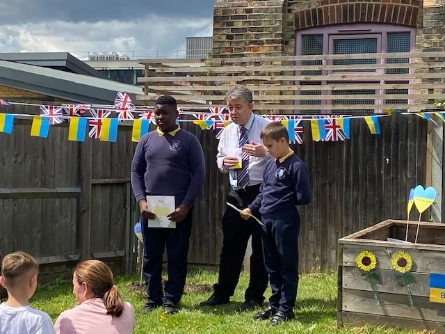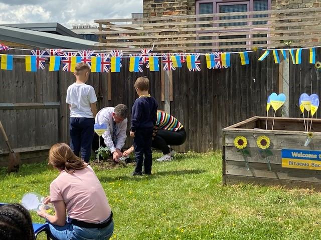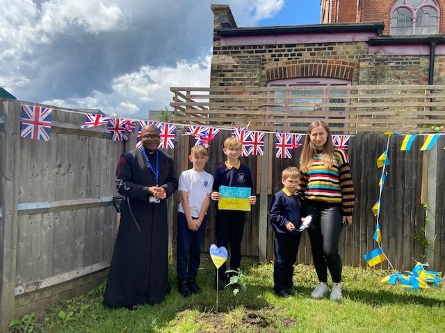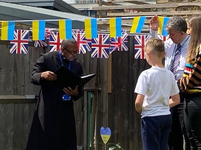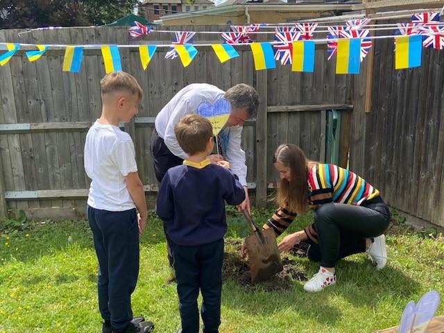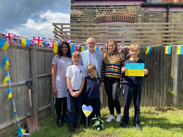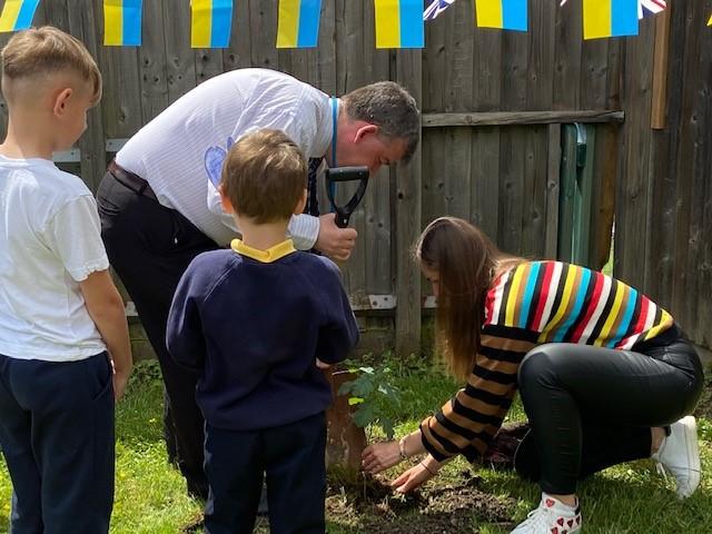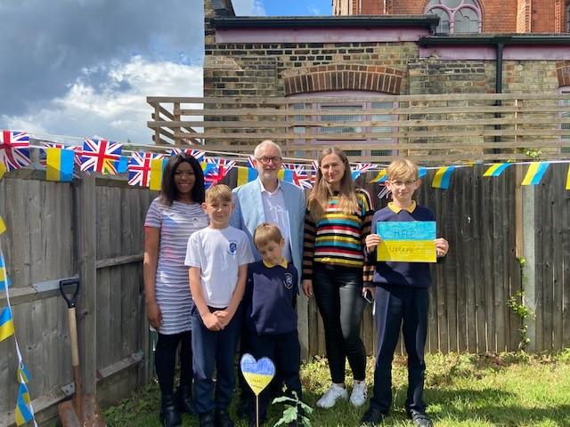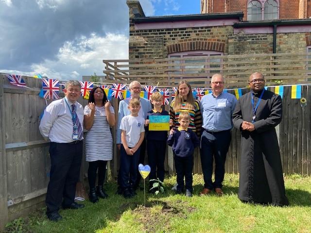 We have been lucky enough to welcome some Ukrainian families and children into our school community recently. To say thank you, one of our families donated an oak tree to our school. We held a tree planting ceremony that our MP Jeremy Corbyn and Counsellor Ngongo attended. Father Chinedu blessed the tree and two of our children read a prayer in Ukrainian and English.